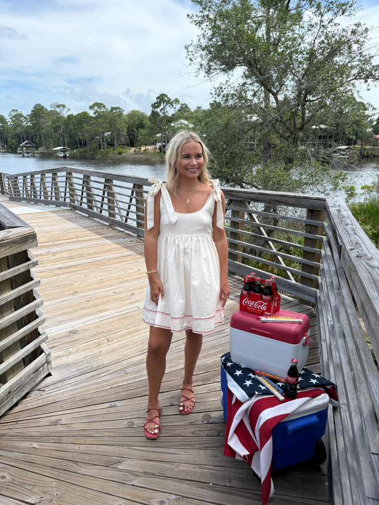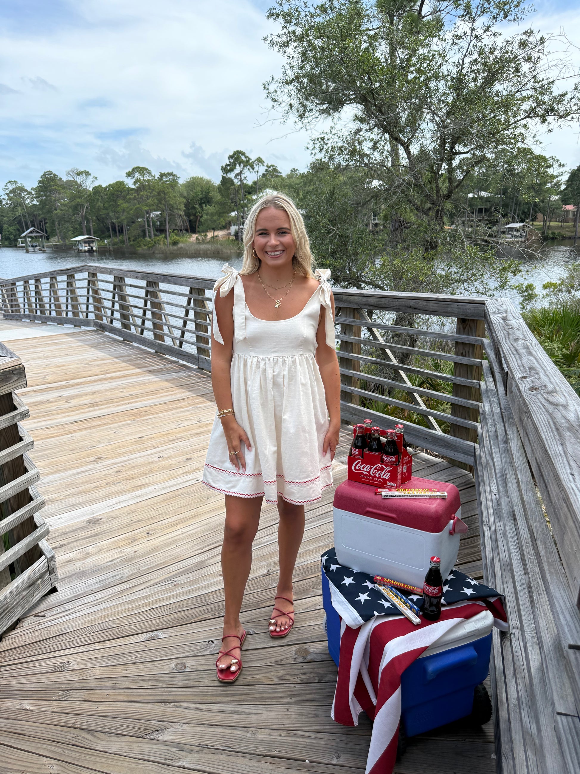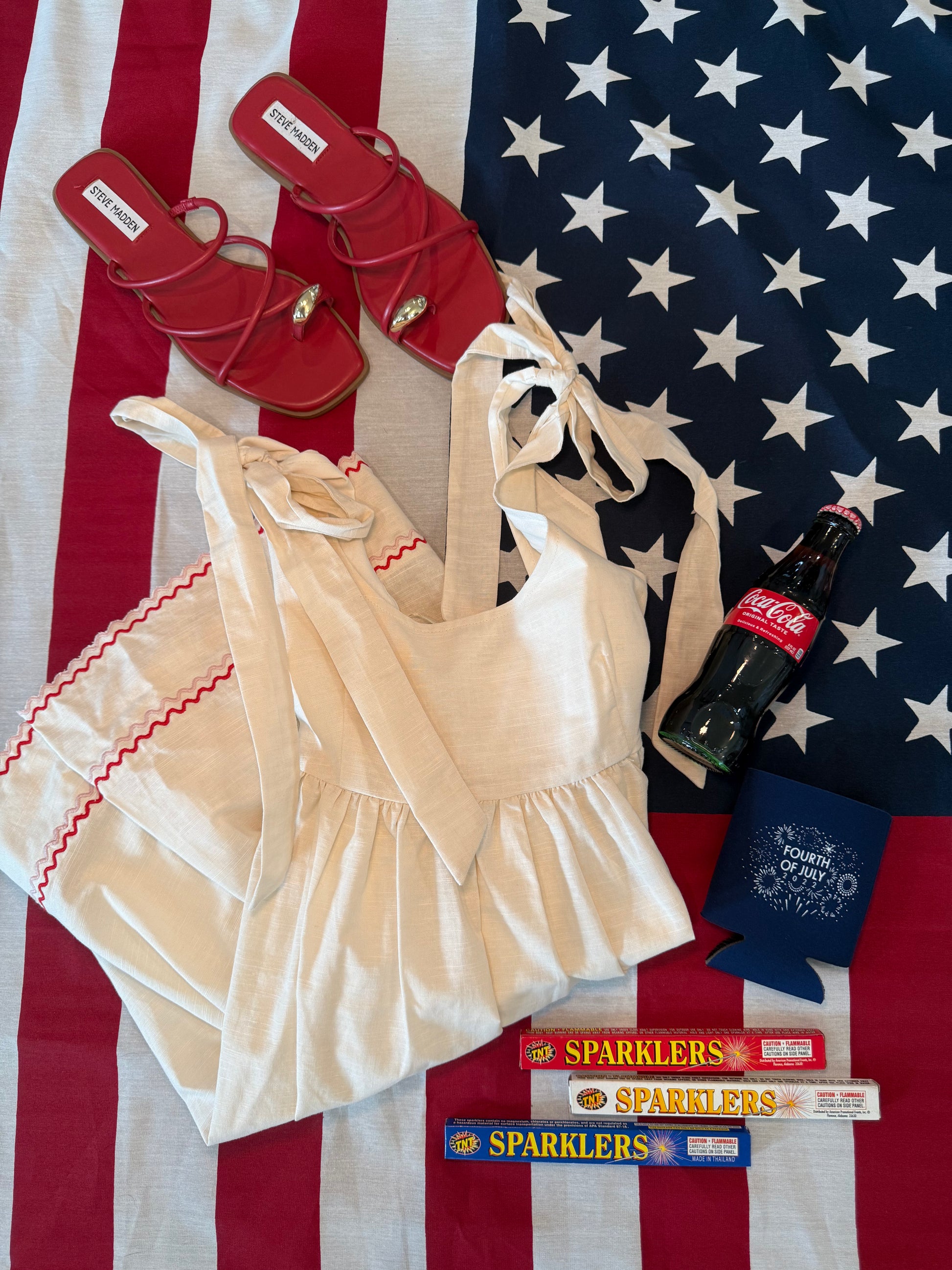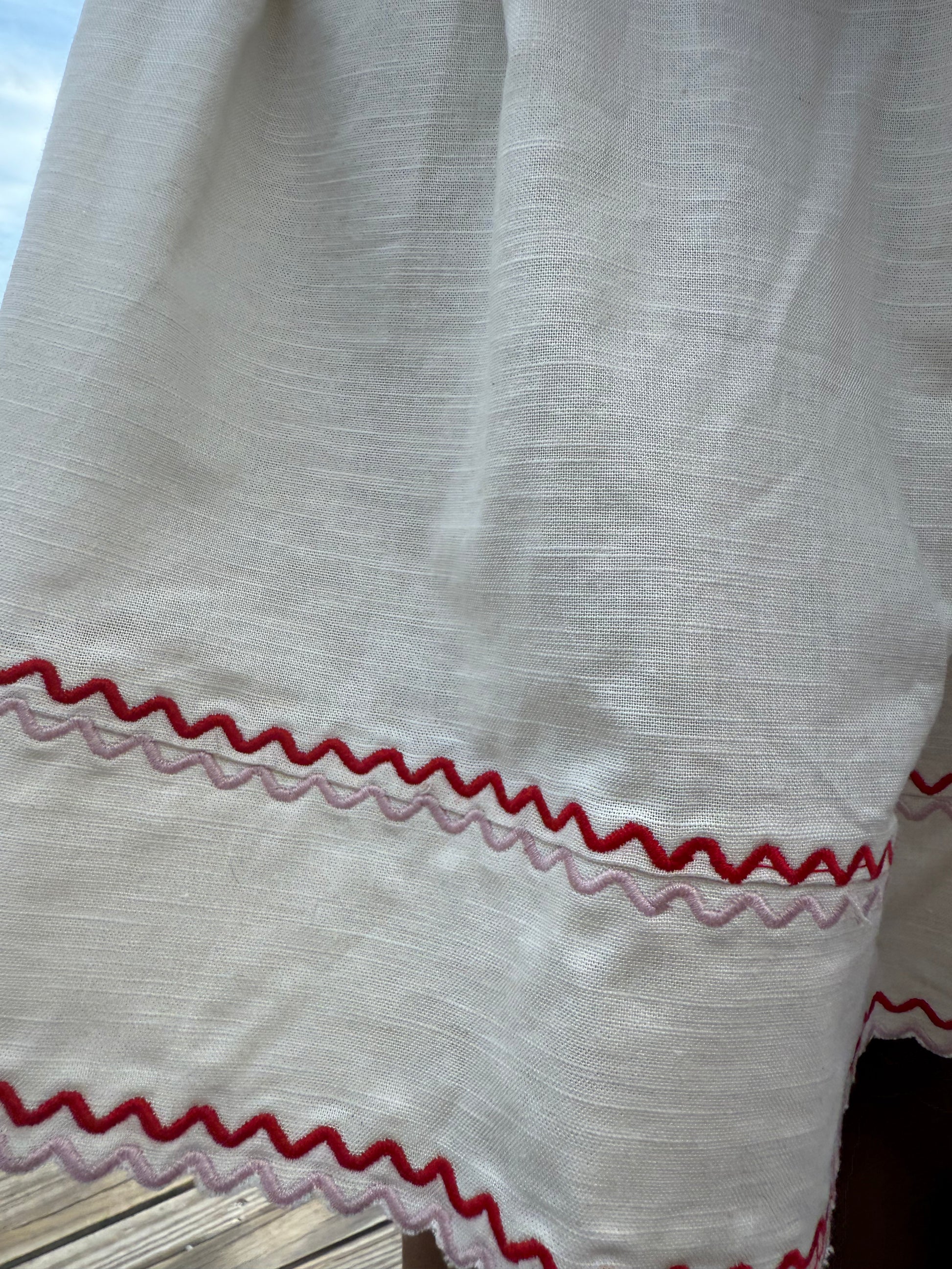Solid linen mix with contrast zig zag embroidery detail, side button closure, sleeveless shoulder ties with open scoop back detail and inner lining.
